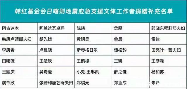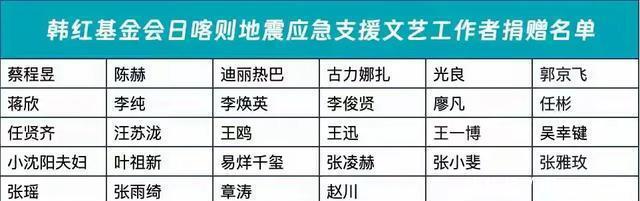 根据〝韩红爱心慈善基金会”蓝V官方账号公布的信息。本轮“西藏日喀则地震定向捐赠”于2025年1月8日20:00结束(进入官方网的有弹窗消息),合计在演艺圈共有74位文体工作者参与捐赠,总计捐款金额1320万元。名单如下: